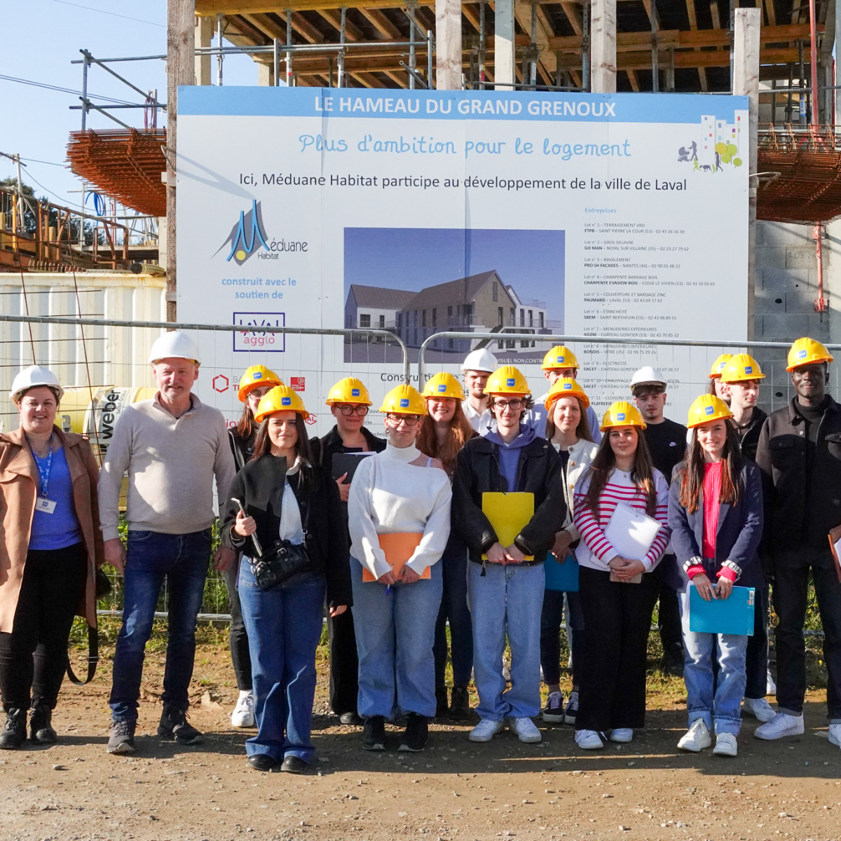 Ce jeudi 24 octobre, nos étudiants de deuxième année du BTS Professions Immobilières de l'école de commerce AFTEC de Laval ont eu l'opportunité de visiter un chantier porté par Méduane Habitat. Ce projet de construction de logements sociaux propose 14 nouvelles unités. Ils ont ainsi pu observer de près les différentes phases de l’opération, de la conception architecturale à la réalisation technique, tout en échangeant avec les professionnels sur site.